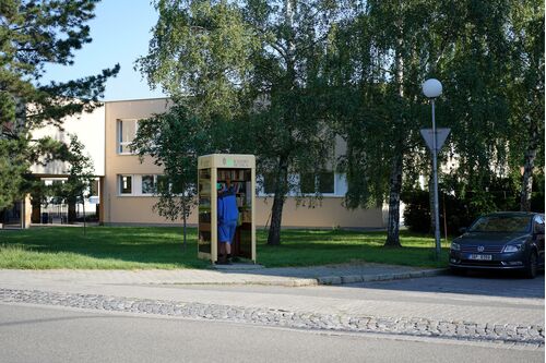 α7RII / FE 55mm F1.8 ZA / チェコ Zlin / 2018.5.29 ズリーンの街を歩いていたら面白いものを見つけた。横から見た時は電話ボックスかと思っていたんだけど・・・ 正面からよく見ると、ありゃ棚に本がギッシリ・・・電話ボックスならぬ図書ボックスじゃぁ…