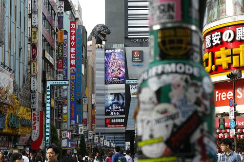 dp3 merrill 50mm F2.8 / 新宿 歌舞伎町 / 2019.4.28 今日は美智子様が天皇陛下を守ろうとするVTRを見て号泣した沼おじさん夫婦。平成天皇皇后は思いやりの象徴でしたね。 さて、妻が電車の窓からゴジラを見たと言うので、原宿かどっかの壁に書いてあるゴジ…