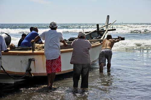 dp3 merrill 50mm F2.8 / 神奈川県 藤沢市 / 鵠沼海岸 / 2013.9.21 さぁ、野郎ども船出の時間だ〜 !! 最近気温も上がってきてステテコで過ごせるようになったから海の写真でも www 真っ黒なおじさん達が船を海に押し出していますが、これは地引網漁の準備…