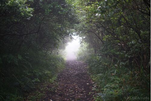 α7RII / FE 55mm F1.8 ZA / 東京都 大島町 / 裏砂漠 / 2020.7.9 怪しく霧の立ち籠める木立のトンネル・・出口は光の靄に包まれて先も見えない。それでも何かに誘われる様に進んで行く・・ この道は伊豆大島は三原山の東側に広がる砂漠地帯へつながる山道だ・…