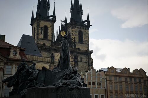 α7RII / FE 55mm F1.8 ZA / チェコ プラハ / 旧市街広場 / 2018.6.1 急に降り出した雨に、のんびりとプラハ旧市街を楽しんでいた観光客たちも、慌てて雨宿り先を探して右往左往し始めた・・ 旧市街広場の顔とも言える『 ティーン教会 ( ティーン前の聖母マリ…